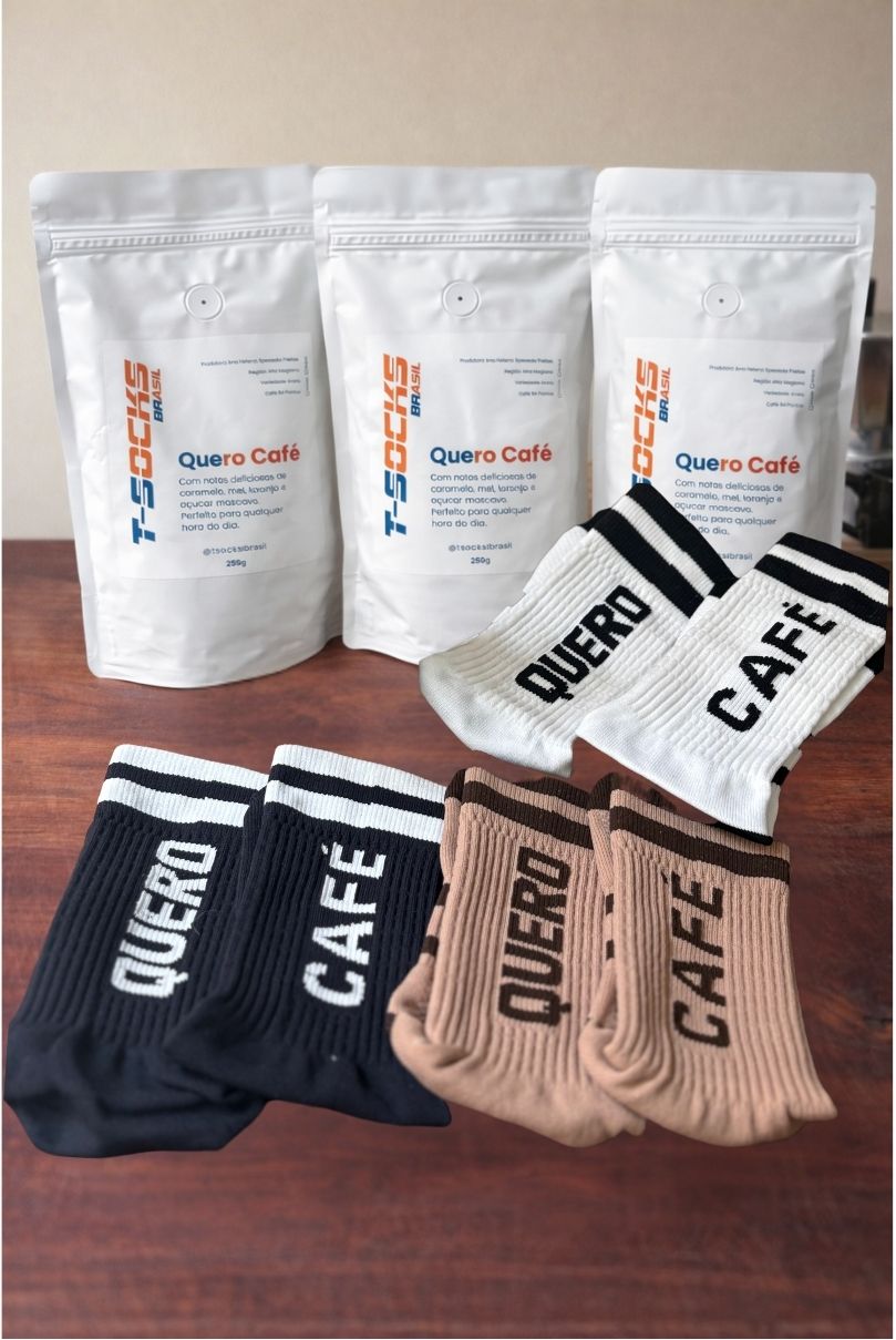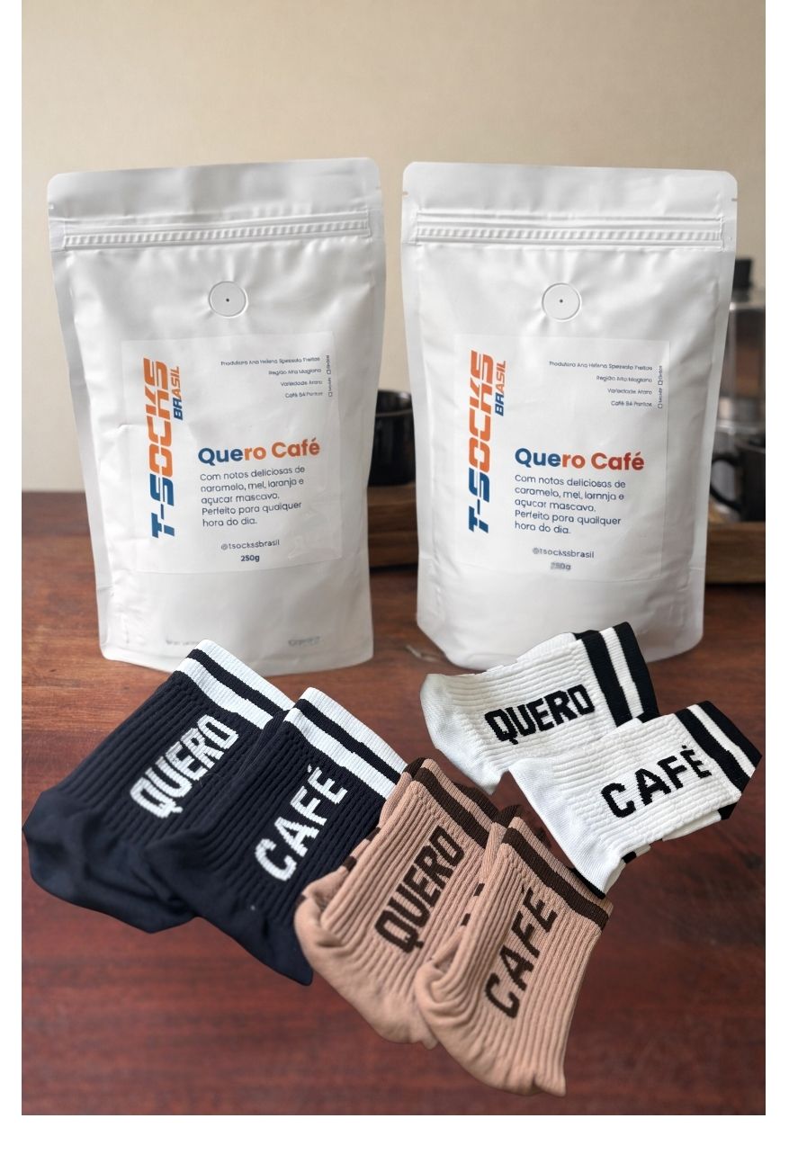 ☕🔥 KIT QUERO CAFÉ + CAFÉ ESPECIAL T-SOCKS CARAMELO & NOZES